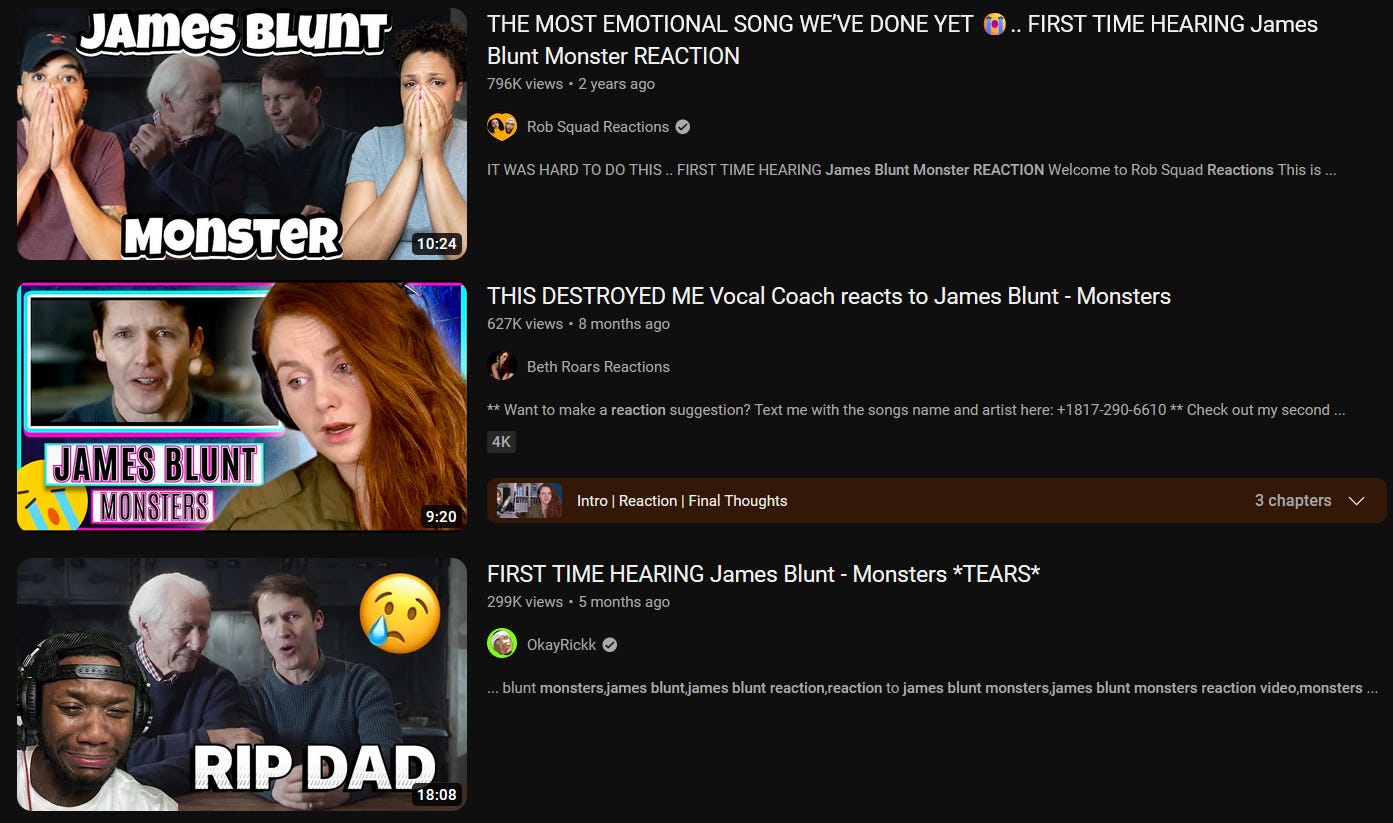 It can be interesting to see the gray areas where reactors, as a community, do of course play up the affects and the effects, but where these are often tapping into something that feels a little more, dare we say, genuine. James Blunt’s “Monsters,” a sentimental song about a parent’s mortality that is pretty disarming in its sincerity, is maybe the key example of this: there are tons of videos on YouTube of people really, as they say, “feeling their emotions.” Ugly crying. But then again, in its semi-viral function, the song kind of sets people up to have this response. “OMG, 45-year-old Marine cries to James Blunt. THIS BROKE ME.”