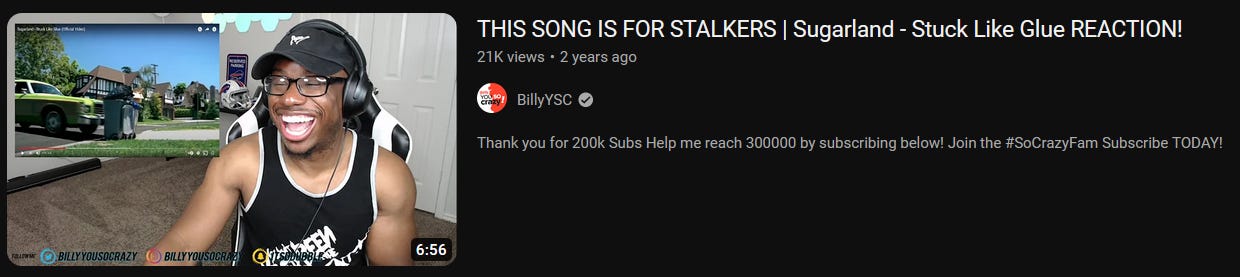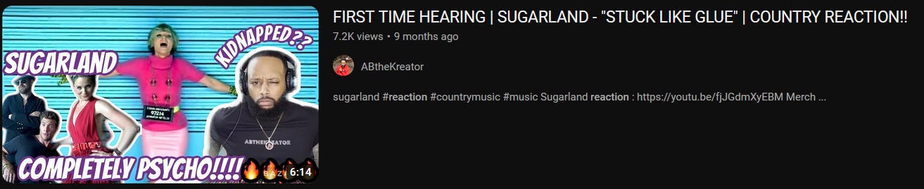 Some reaction videos are to lyrics vids, or live performances, or something else. But if there is an original music video that goes along with the song, the reactors will often interpret the music and the video together, as if they are of a piece (rather than the video representing one possible expression or interpretation of the basic material of the song itself). See what I mean, in reaction videos to Sugarland’s “Stuck Like Glue,” whose video is about a crazy-wannabe-girlfriend-stalker, but whose song content, lyrically, isn’t.